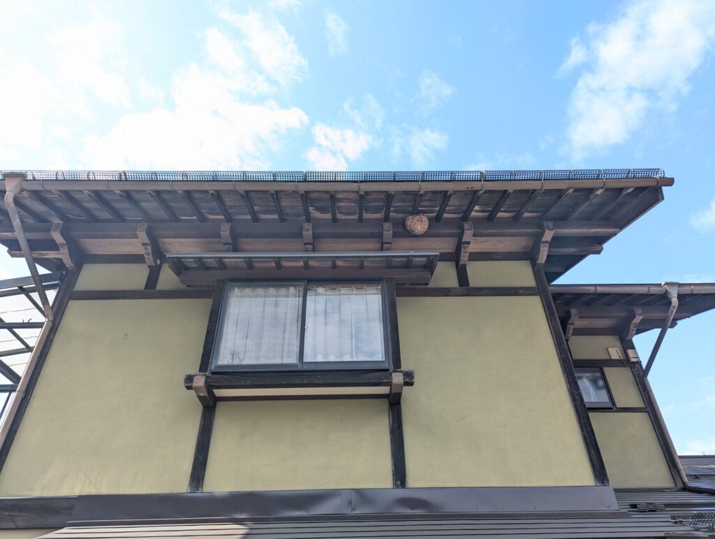 現場を確認すると、2階軒下と真下の庇(ひさし)が重なる「二枚軒」の死角に、巨大なキイロスズメバチの巣がありました。お部屋からは全く見えない死角でしたが、逆に蜂からもお客様が見えなかったため、刺される被害が出ずに済んだのは不幸中の幸いでした。