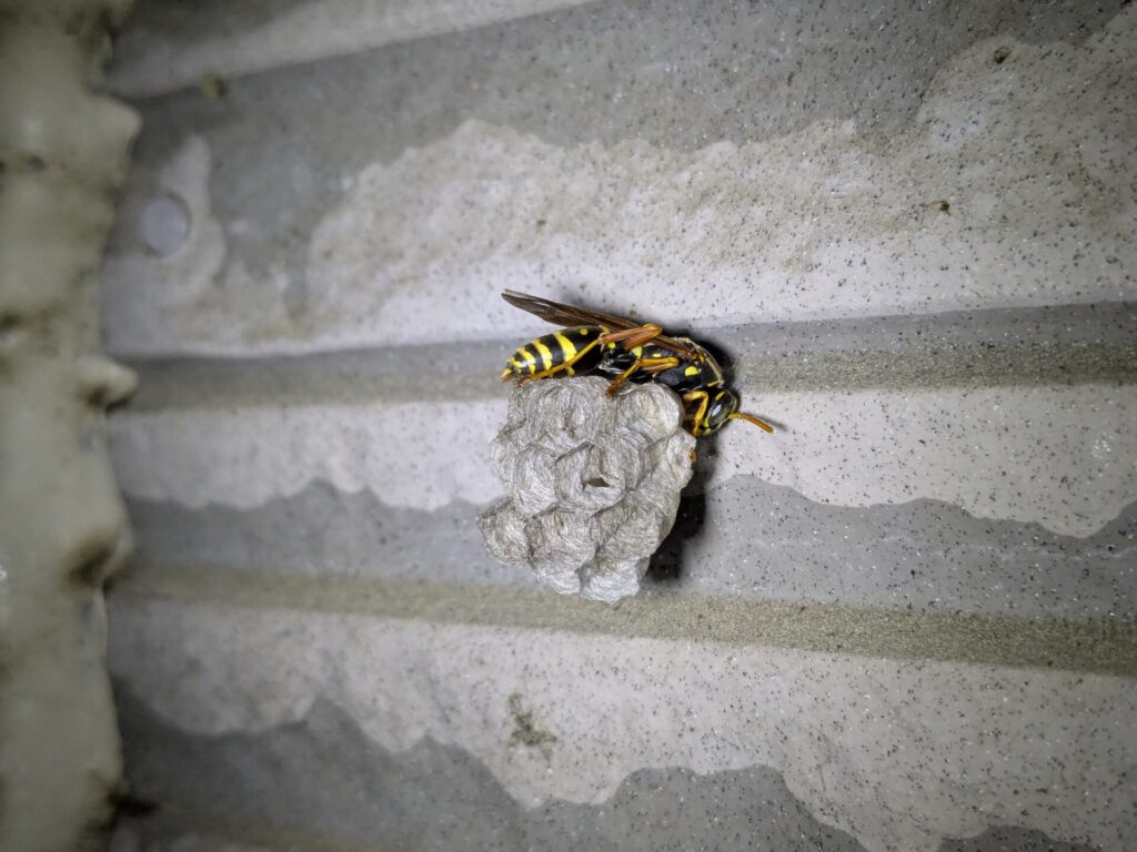 【豊明市二村台】の民家外壁に営巣したフタモンアシナガバチ