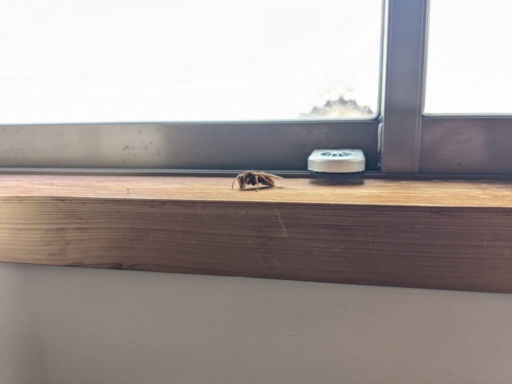 お部屋の中を確認させていただきましたが、蜂が飛んでいる様子はなく窓も締め切った状態ですので、外に出ることは不可能な状態でした。